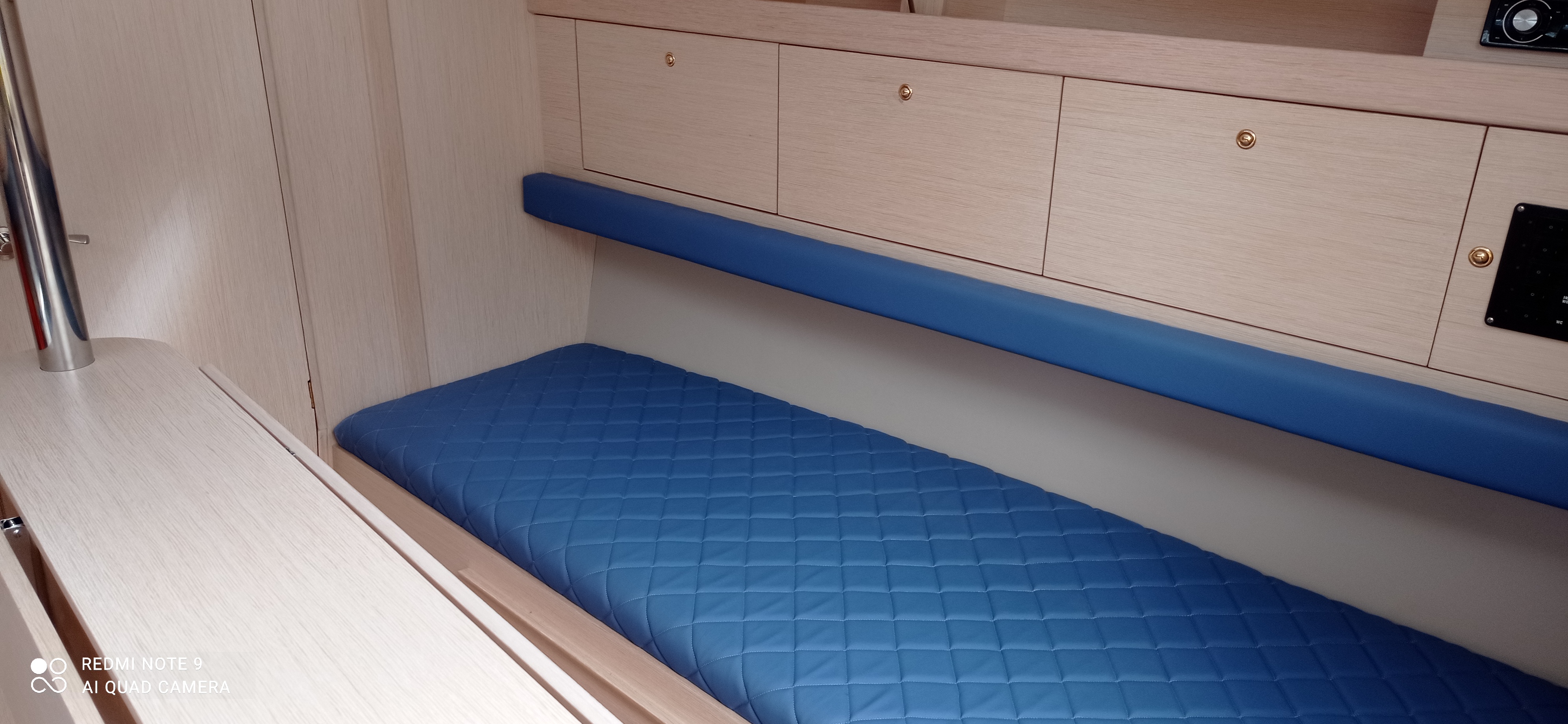 Bardzo obszerne wnętrze daje poczucie absolutnego komfortu i intymności dla 6 – 8 osobowej załogi. Zabudowa jachtu zawiera dwie zamykane kabiny: dziobową i rufową. Kabina sanirtarna w elektrycznym WC.